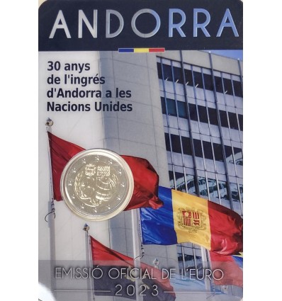 Pièce de 2 euros Andorre 2023 qui commémore le 30ème anniversaire de l'intégration d'Andorre aux Nations Unies.