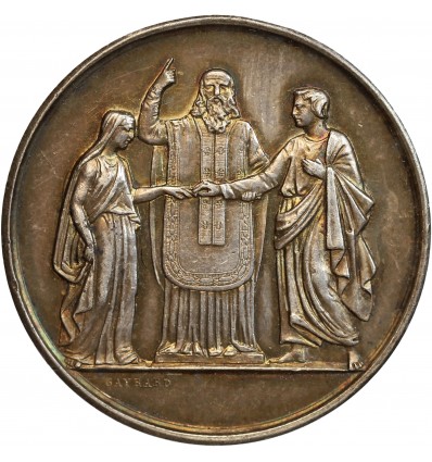 Prêtre qui bénit un couple vêtu à l'antique - initiales au revers dans une couronne de fleurs