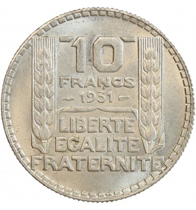 Revers : 10 / FRANCS / 1931 / LIBERTE / EGALITE / FRATERNITE entre deux épis de blé verticaux