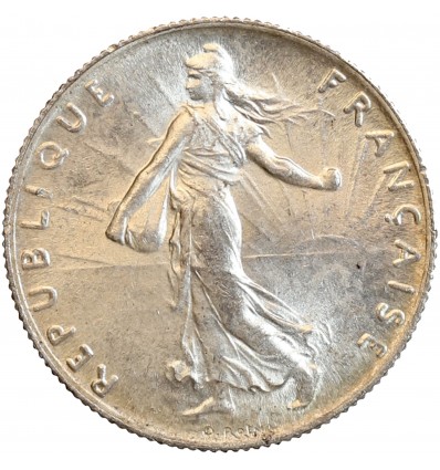 Avers : la Semeuse, symbole de la République Française avec en arrière plan le soleil sur la ligne d'horizon