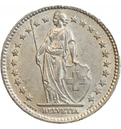 Avers : Helvetia debout vêtue d'une toge, appuyée contre un bouclier et tenant une lance