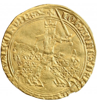 Avers : Jean II à cheval, galopant vers la gauche, l'épée haute, portant une cotte d'armes et coiffé d'un heaume couronné